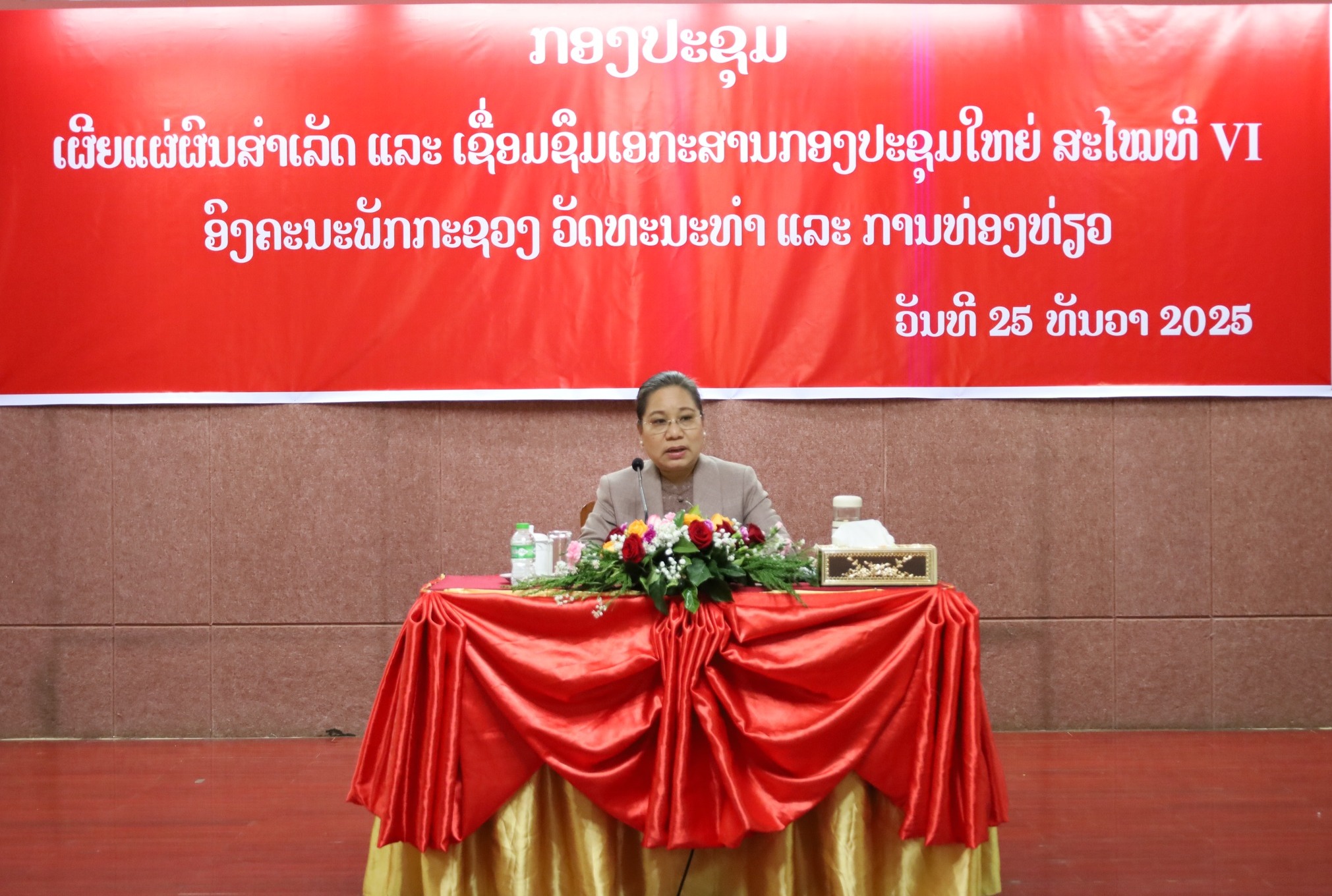 ໃນຕອນເຊົ້າຂອງວັນທີ 25 ທັນວາ 2025 ທີ່ ຫໍວັດທະນະທໍາແຫ່ງຊາດ ກະຊວງ ວທ ໄດ້ຈັດກອງປະຊຸມເຜີຍແຜ່ຜົນສຳເລັດ ແລະ ເຊື່ອມຊຶມເອກະສານກອງປະຊຸມໃຫຍ່ສະໄໝທີ VI ອົງຄະນະພັກກະຊວງວັດທະນະທຳ ແລະ ການທ່ອງທ່ຽວ ໂດຍການເປັນປະທານຂອງສະຫາຍ ນາງ ສວນສະຫວັນ ວິຍະເກດ ກໍາມະການສູນກາງພັກ ເລຂາຄະນະພັກ ລັດຖະມົນຕີກະຊວງ ວທ, ມີສະຫາຍ ວັນສີ ກົວມົວ ກຳມະການສຳຮອງສູນກາງພັກ ຮອງເລຂາຄະນະພັກ ຮອງລັດຖະມົນຕີກະຊວງ ວທ, ມີບັນດາສະຫາຍຄະນະປະຈໍາພັກ, ເລຂາໜ່ວຍພັກ, ຫົວກົມ, ສະຖາບັນ, ກອງວິຊາການ ພະນັກງານຫຼັກແຫຼ່ງເຂົ້າຮ່ວມ.